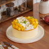 Điểm cộng của chiếc bánh còn nằm ở vẻ ngoài tươi sáng, rực rỡ như một mặt trời nhỏ. Bề mặt trang trí xoài tươi vàng ươm, ở giữa bề mặt bánh được bắt một đường kem tươi trắng muốt mang lại sự hài hòa với màu vàng tổng thể của bánh.